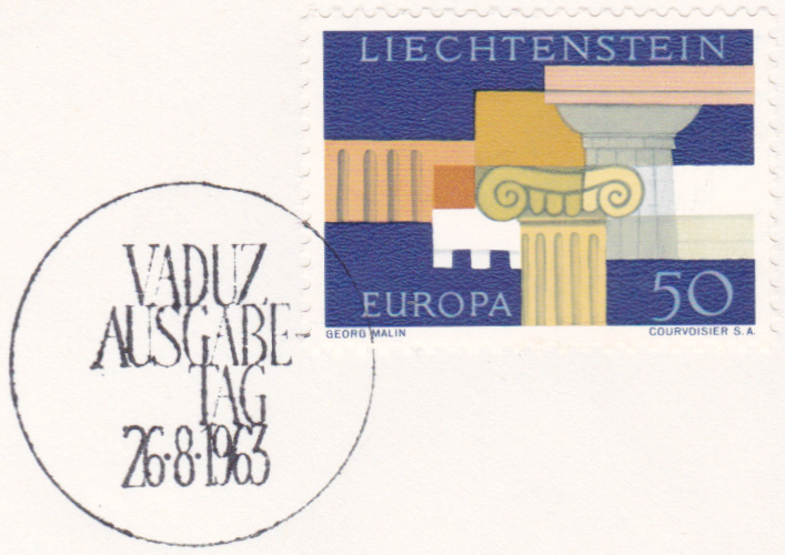 In Liechtenstein erschien eine Europamarke 1963 am 26. August 1963 wieder nicht im Gemeinschaftsmotiv sondern sie zeigte Griechische Architekturelemente. Die Auflage dieser Marke zu 50 Rappen betrug 1 507 479 Stück.