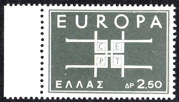 In Griechenland erschienen die Europamarken 1963 am 16. Sept. 1963. Hier die Marke zu 2,50 Drachmen dunkelgelbgrün mit dem Gemeinschaftsmotiv "Buchstaben „CEPT“ in Ornament", die in einer Auflage von 2 360 097 Stück erschien.