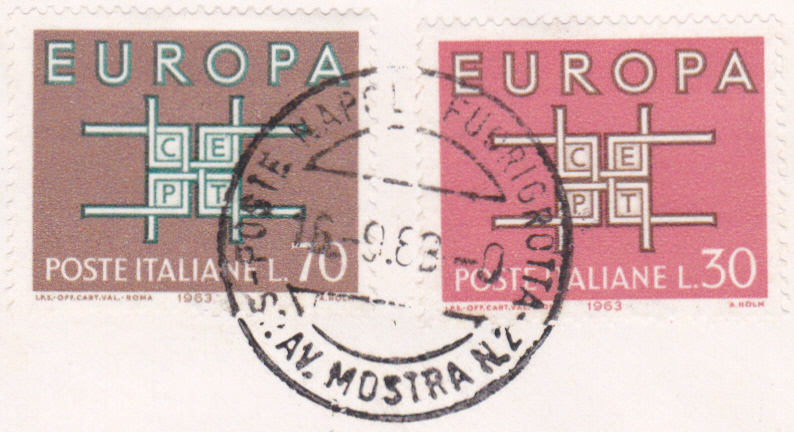 Briefausschnitt mit den beiden Europamarken 1963 aus Italien mit einem Tagesstempel aus Neapel (Napoli Fuorigrotta ist ein Ortsteil von Neapel) vom Ersttag.