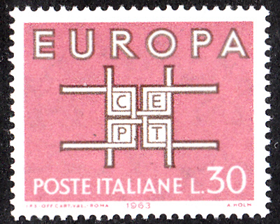 In Italien erschienen die Europamarken 1963 am 16. Sept. 1963. Hier die Marke zu 30 Lire bräunlichkarmin/braun mit dem Gemeinschaftsmotiv "Buchstaben „CEPT“ in Ornament", die in einer Auflage von 29 925 055 Stück erschien.