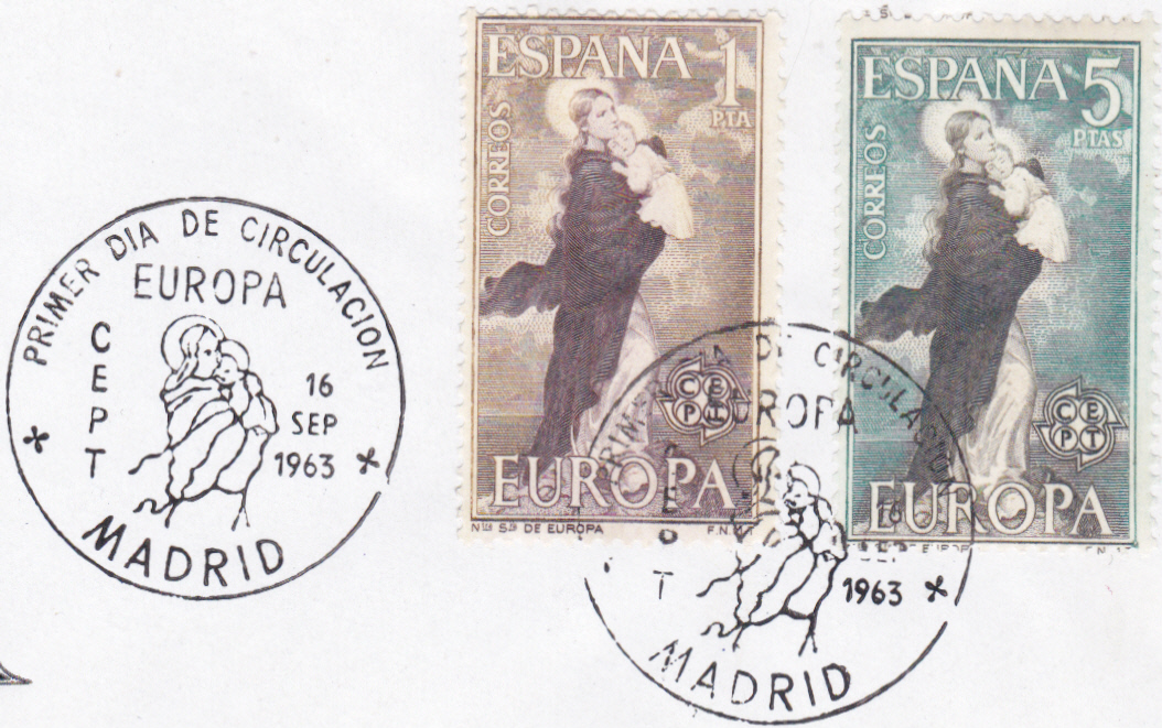 Die Europamarken 1963 erschienen in Spanien am 16.9.1963. Als Motiv diente nicht das Gemeinschaftsmotiv sondern "Unsere Liebe Frau von Europa" (von Ferruzzio) und das CEPT-Emblem. Hier die Marke zu 5 Pta dunkelblaugrün/lilaschwarz, die in einer Auflage von 3 500 000 erschien.