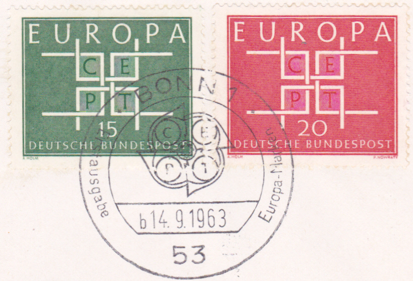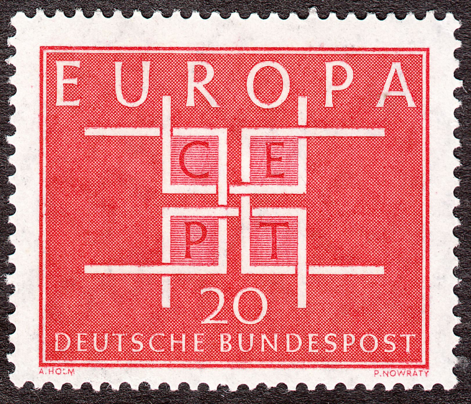 Am 14.09.1963 erschien in einer Auflage von 110 Millionen Stück diese Europamarke der Wertstufe 20 Pfennig, katalogisiert als MiNr. 407: