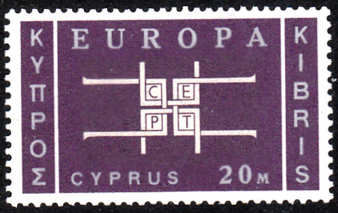 In Zypern erschienen die Europamarken 1963 am 4. November 1963. Hier die Marke zu 20 Mills mit dem Gemeinschaftsmotiv "Buchstaben „CEPT“ in Ornament ", die in einer Auflage von 560 863 Stück erschien.
