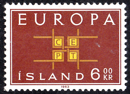 In Island erschienen die Europamarken 1963 am 16. Sept. 1963. Hier die Marke zu 6,00 Kronen mit dem Gemeinschaftsmotiv "Buchstaben „CEPT“ in Ornament", die in einer Auflage von 1 500 000 Stück erschien.