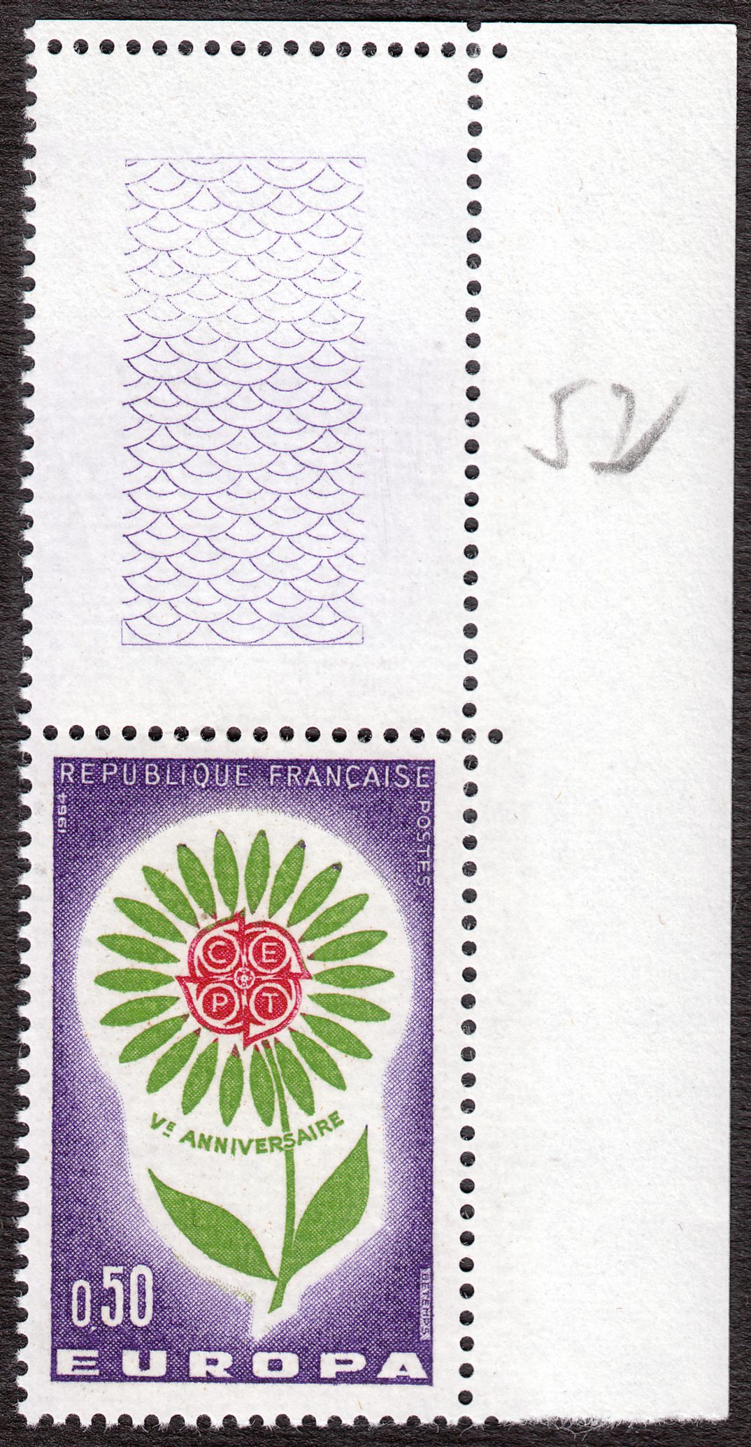 In Frankreich erschienen die Europamarken 1964 am 12. Sept. 1964. Hier die Marke zu 0,50 Francs mit dem Gemeinschaftsmotiv "Stilisierte Blume mit 22 Blütenblättern um CEPT-Emblem", die in einer Auflage von 10 225 000 Stück erschien.