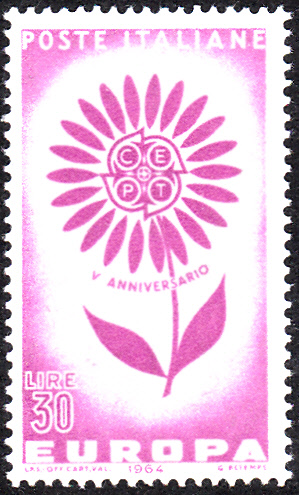 1964 erschienen zum 5jährigen Bestehen der CEPT insgesamt 36 Europamarken in 19 Ländern. Einheitliches Design war eine vom französischen Künstler Georges Bétemps entworfene stilisierte Blume mit 22 Blütenblättern und dem Emblem der CEPT.