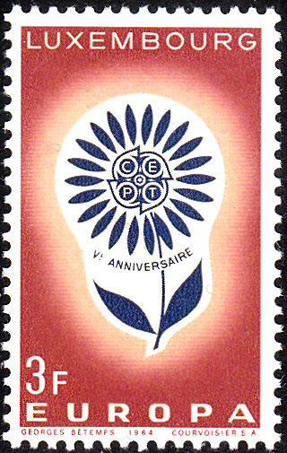 In Luxemburg erschienen die Europamarken 1964 am 14. September 1964. Hier die Marke zu 3 Fr mit dem Gemeinschaftsmotiv " Stilisierte Blume mit 22 Blütenblättern um CEPT-Emblem", die in einer Auflage von 2 580 000 Stück erschien.