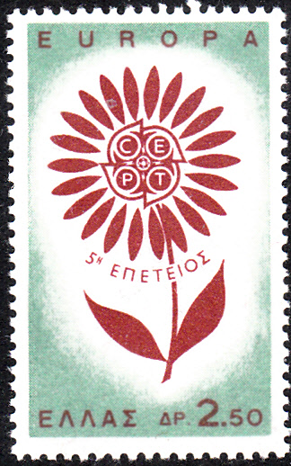 In Griechenland erschienen die Europamarken 1964 am 14. September 1964 im Gemeinschaftsmotiv "Stilisierte Blume mit 22 Blütenblättern um CEPT-Emblem". Hier die Marke zu 2,50 Drachmen blaugrün/bräunlichkarmin, die in einer Auflage von 2 421 877 Stück erschien.