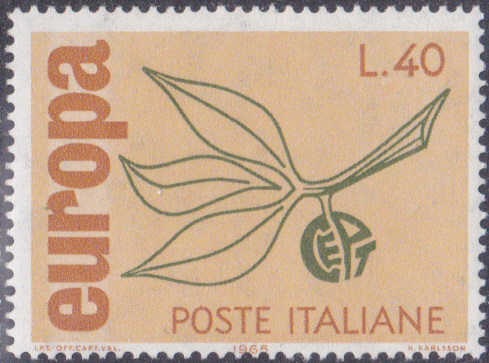 In Italien erschienen die Europamarken 1965 am 27. September 1965. Hier die Marke zu 40 Lire mit dem Gemeinschaftsmotiv "Zweig mit aus den Buchstaben „CEPT“ gebildeter Frucht ", die in einer Auflage von 34 721 085 Stück erschien.
