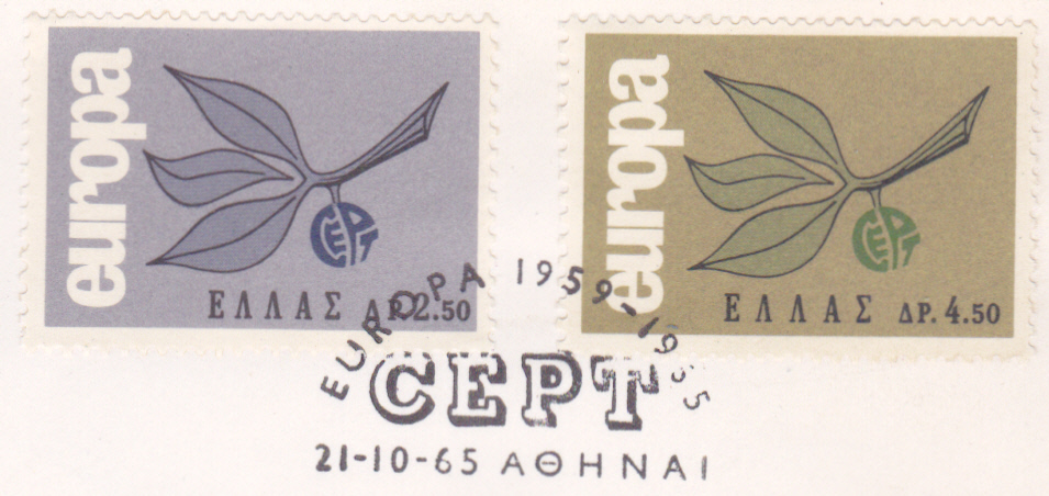 In Griechenland erschienen die Europamarken 1965 am 21. Oktober 1965. Hier die Marke zu 4,50 Drachmen mit dem Gemeinschaftsmotiv "Zweig mit aus den Buchstaben „CEPT“ gebildeter Frucht ", die in einer Auflage von 1 305 946 Stück erschien.