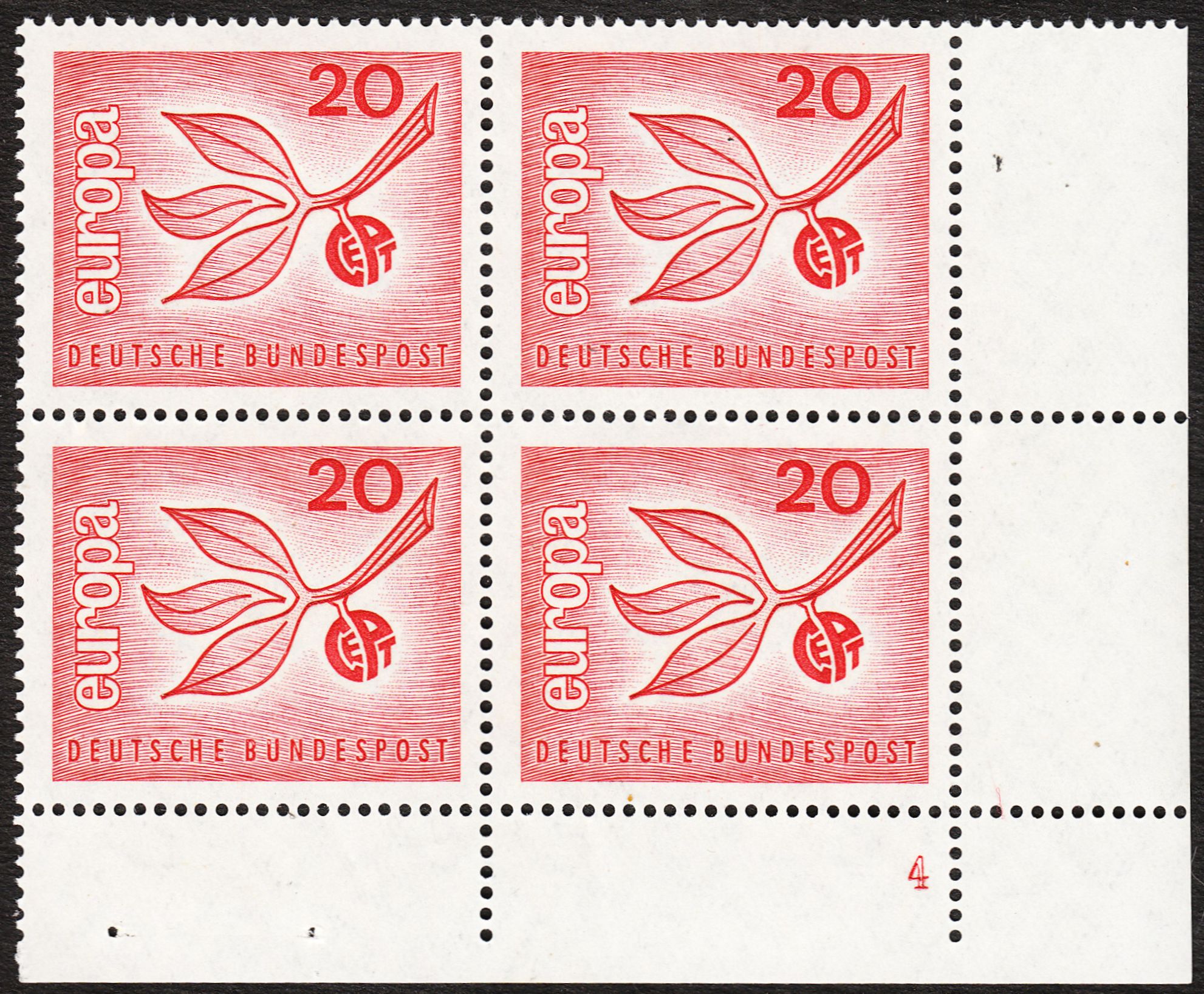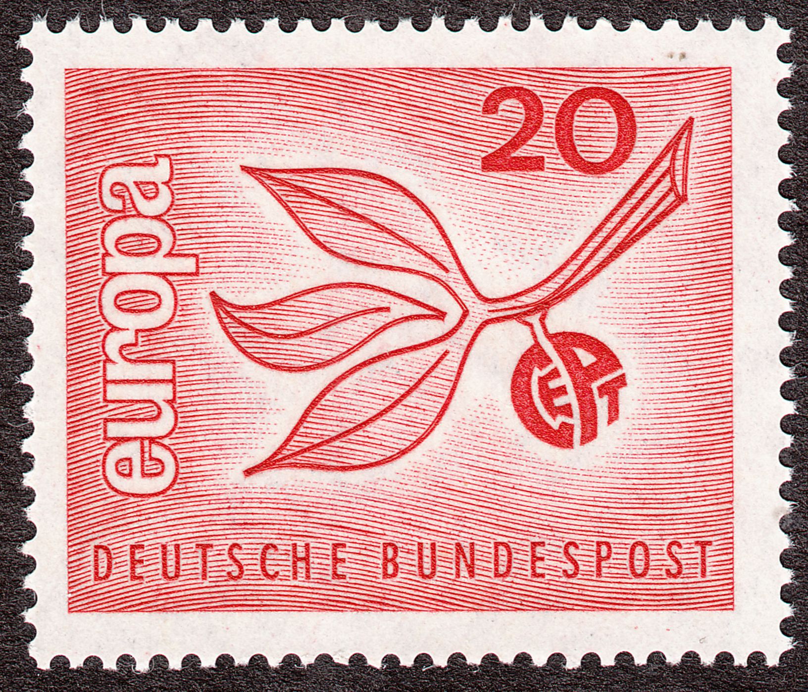 1965 war das einheitliche Motiv der insgesamt 36 in 19 Ländern ausgegebenen Europamarken ein von dem isländischen Künstler Hördur Karlsson entworfener Zweig mit drei Blättern sowie einer aus den Buchstaben CEPT gebildeten Frucht. Die 3 Blätter stehen dabei für Postwesen,Telegraphie und Telefonie.