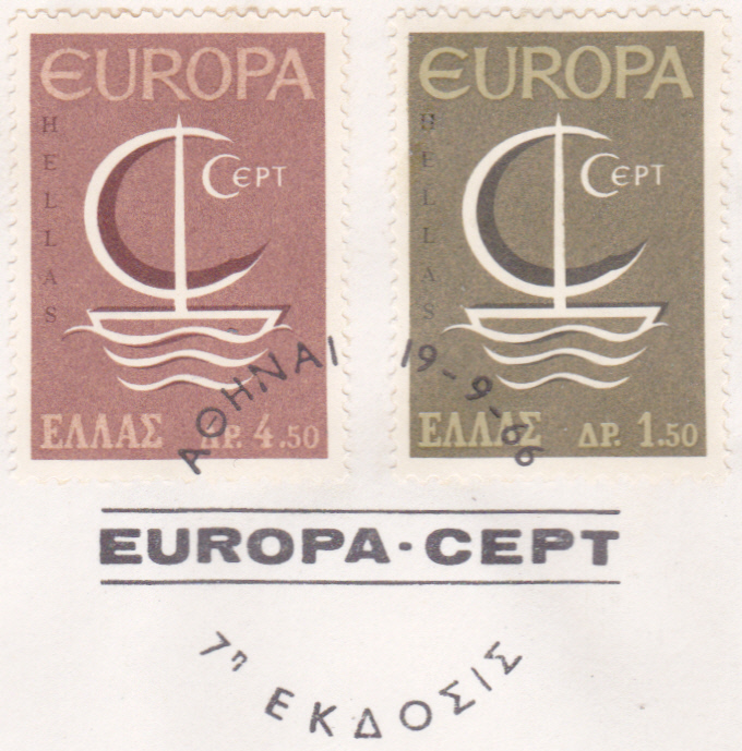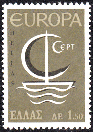 In Griechenland erschienen die Europamarken 1966 am 19. September 1966. Hier eine postfrische Marke zu 1,50 Drachmen braun-/schwarzoliv mit dem Gemeinschaftsmotiv "Stilisiertes Boot mit geblähtem Segel und Inschrift „CEPT“", die in einer Auflage von 7 566 997 Stück erschien.