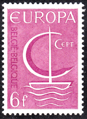 In Belgien erschienen die Europamarken 1966 am 24. September 1966. Hier eine postfrische Marke zu 6 Francs helllilapurpur mit dem Gemeinschaftsmotiv "Stilisiertes Boot mit geblähtem Segel und Inschrift „CEPT“", die in einer Auflage von 2 500 000 Stück erschien.