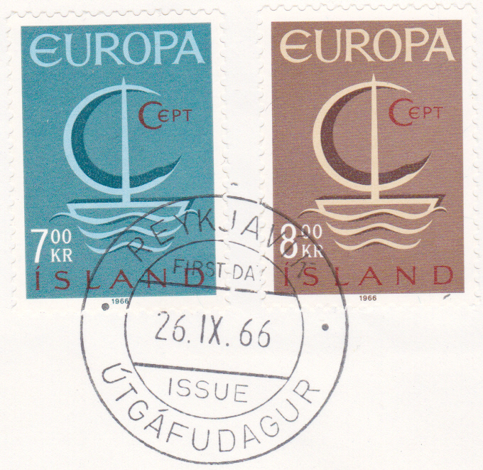 In Island erschienen die Europamarken 1966 am 26. Sept. 1966. Hier die Marke zu 7,00 Kronen mit dem Gemeinschaftsmotiv "Stilisiertes Boot mit geblähtem Segel und Inschrift „CEPT“", die in einer Auflage von 1 000 000 Stück erschien.