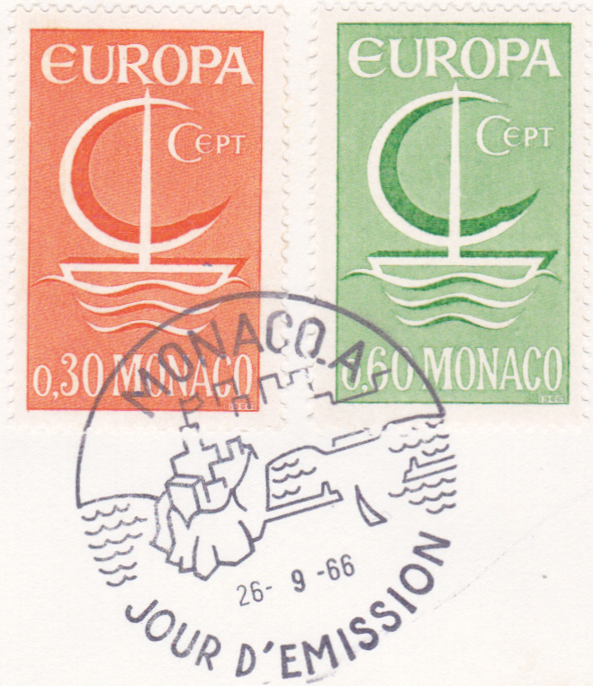 In Monaco erschienen die Europamarken 1966 am 26. September 1966. Hier eine postfrische Marke zu 0,60 Fr hellgrün mit dem Gemeinschaftsmotiv "Stilisiertes Boot mit geblähtem Segel und Inschrift „CEPT“", die in einer Auflage von 562 346 Stück erschien.