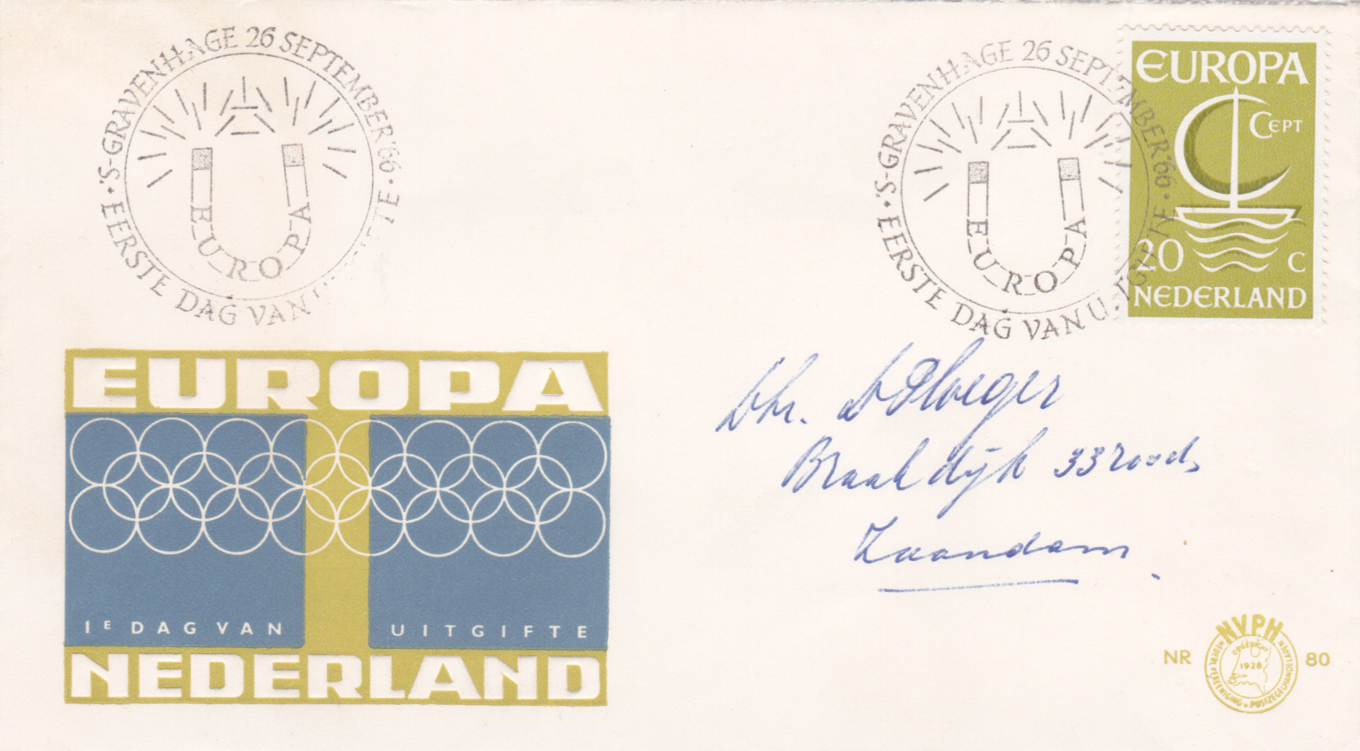 FDC mit der Europamarke 1966 zu 20 Cent aus den Niederlande mit dem Ersttagsonderstempel aus ’s-Gravenhage.