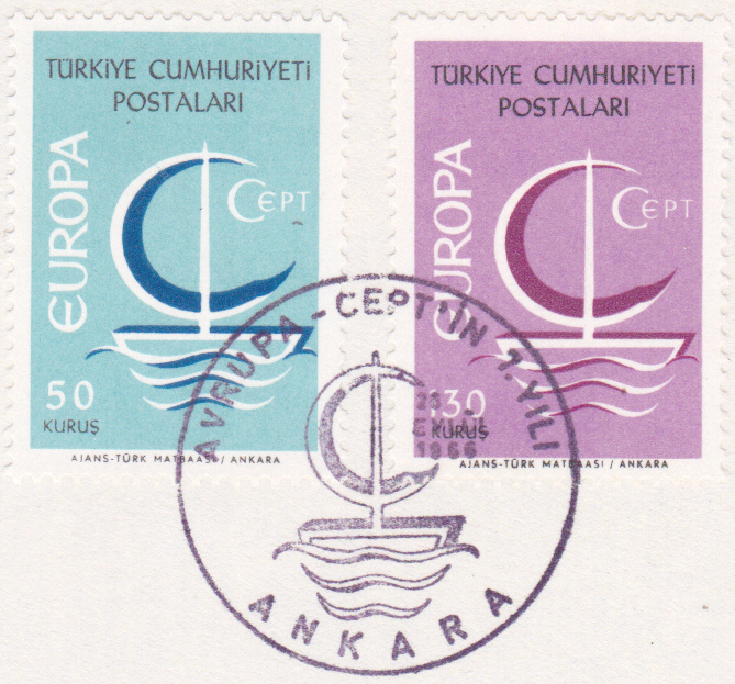 In der Türkei erschienen die Europamarken 1966 am 26. September 1966. Hier die Marke zu 130 Kurus mit dem Gemeinschaftsmotiv "Stilisiertes Boot mit geblähtem Segel und Inschrift „CEPT“", die in einer Auflage von 500 000 Stück erschien.