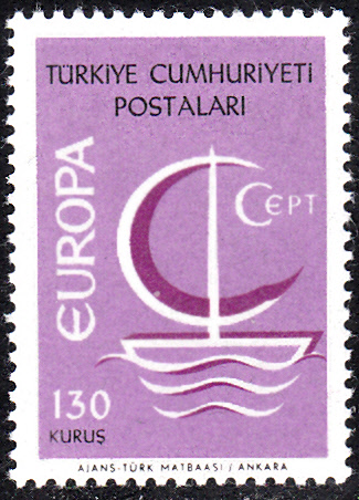 In der Türkei erschienen die Europamarken 1966 am 26. September 1966. Hier die Marke zu 130 Kurus mit dem Gemeinschaftsmotiv "Stilisiertes Boot mit geblähtem Segel und Inschrift „CEPT“", die in einer Auflage von 500 000 Stück erschien.