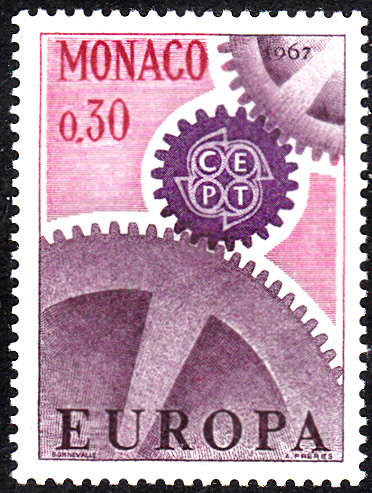 In Monaco erschienen die Europamarken 1967 am 28. April 1967. Hier eine postfrische Marke zu 0,30 Fr mit dem Gemeinschaftsmotiv "Ineinandergreifende Zahnräder, Antriebsrad mit CEPT-Emblem", die in einer Auflage von 1 442 890 Stück erschien.