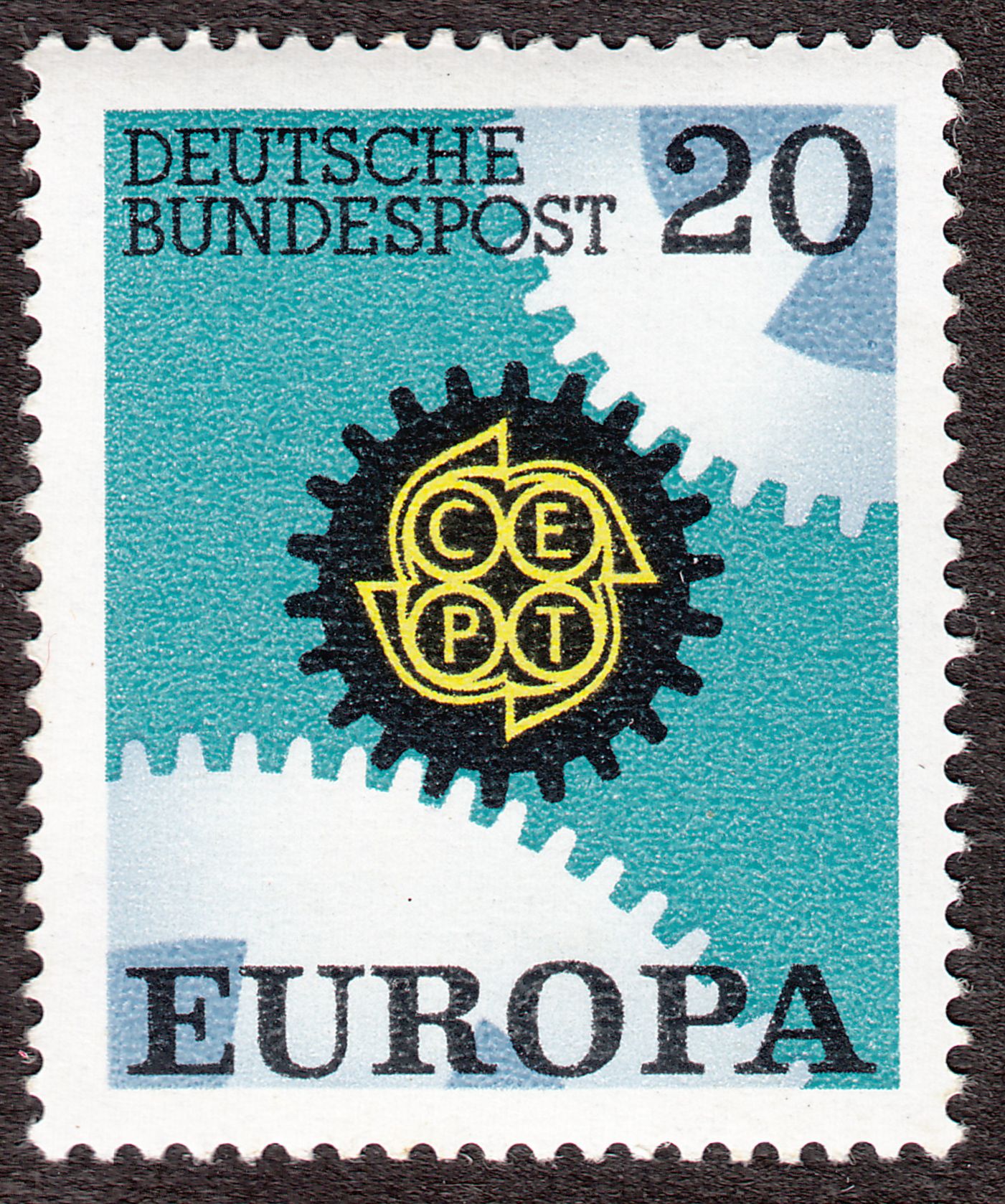 Das einheitliche Motiv "Ineinandergreifende Zahnräder, Antriebsrad mit CEPT-Emblem" für die insgesamt 27 Europamarken aus 19 Ländern des Jahrgangs 1967 entwarf der belgische Künstler Oscar Bonnevalle.