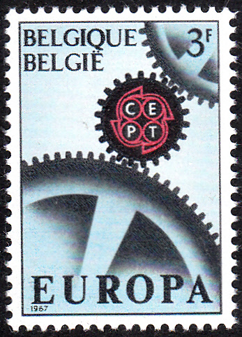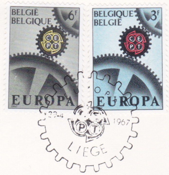 In Belgien erschienen die Europamarken 1967 am 29. April 1967. Hier die Marke zu 3 Francs mit dem Gemeinschaftsmotiv "Ineinandergreifende Zahnräder, Antriebsrad mit CEPT-Emblem", die in einer Auflage von 7 000 000 Stück erschien.