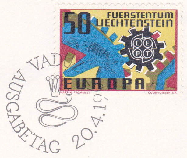 In Liechtenstein erschien eine Europamarken 1967 am 20. April 1967. Hier diese Marke zu 50 Rappen mit dem Gemeinschaftsmotiv "Ineinandergreifende Zahnräder, Antriebsrad mit CEPT-Emblem", die in einer Auflage von 2 234 180 Stück erschien.
