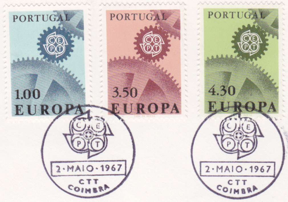 In Portugal erschienen die Europamarken 1967 am 2. Mai 1967. Hier die Marke zu 4,30 Escudo mit dem Gemeinschaftsmotiv "Ineinandergreifende Zahnräder, Antriebsrad mit CEPT-Emblem", die in einer Auflage von 1 500 000 Stück erschien.
