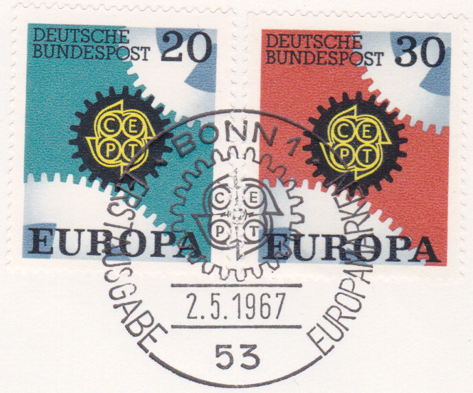 Das einheitliche Motiv "Ineinandergreifende Zahnräder, Antriebsrad mit CEPT-Emblem" für die insgesamt 27 Europamarken aus 19 Ländern des Jahrgangs 1967 entwarf der belgische Künstler Oscar Bonnevalle.