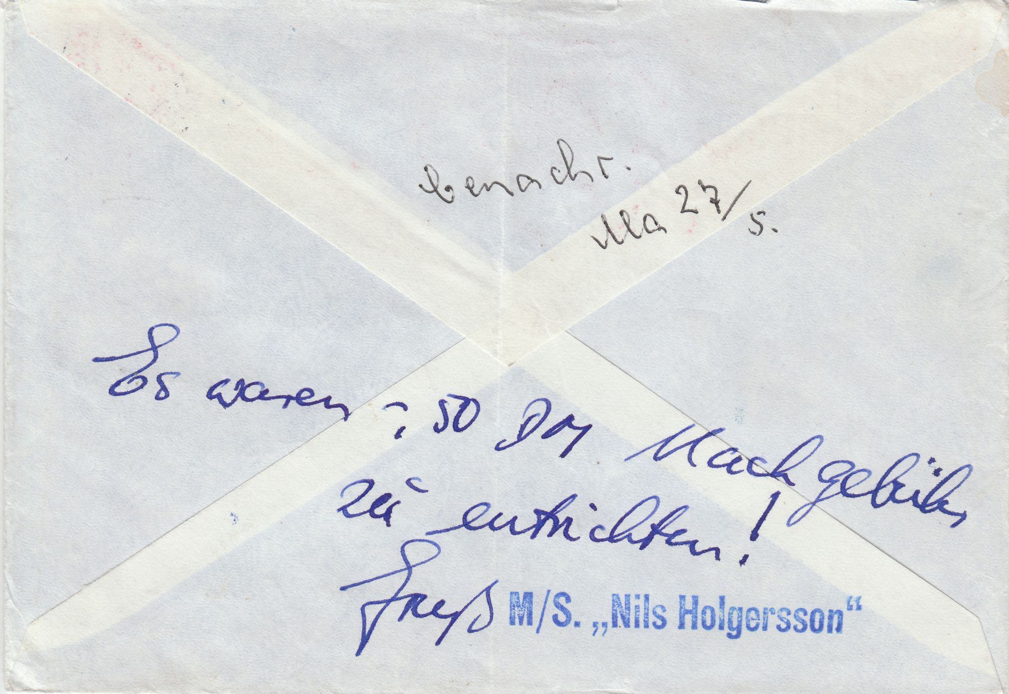 Das Fehlporto in Höhe von 20 Pfennig plus eine pauschale Einziehungsgebühr in Höhe von 30 Pfennig ergeben die in Blaustift ausgewiesenen "50" Pfennig als Nachgebühr, die der Empfänger auf der MS NILS HOLGERSSON, was er rückseitig dokumentierte: