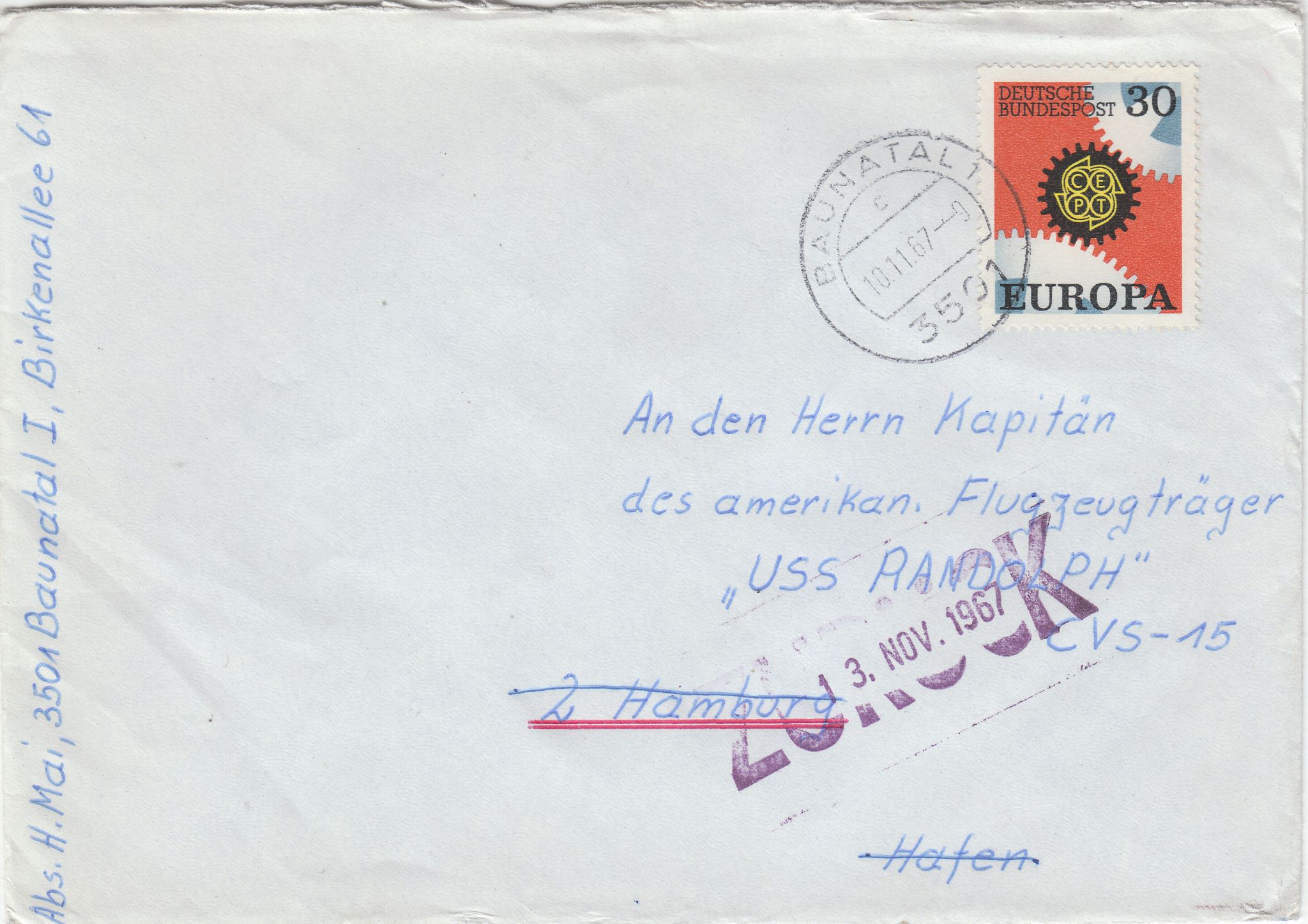 Dieser per EF portogerecht freigemachte Standardbrief wurde am 10.11.1967 in Baunatal aufgegeben und an den amerikanischen Flugzeugträger USS RANDOLPH (CVS-15) adressiert, der 1967 wie bereits im Jahr zuvor den Hamburger Hafen anlaufen sollte: