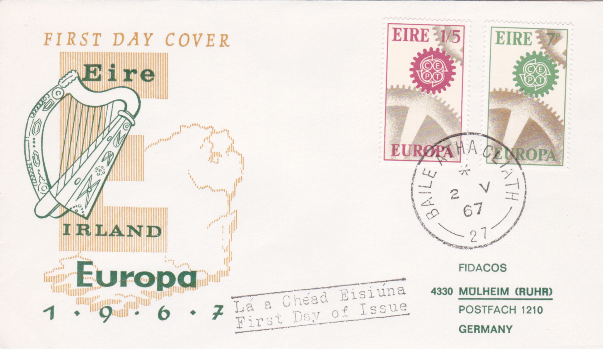 In Irland erschienen die Europamarken 1967 am 2. Mai 1967. Hier die Marke zu 1´5 Sc´Pg lilarot/gold mit dem Gemeinschaftsmotiv "Ineinandergreifende Zahnräder, Antriebsrad mit CEPT-Emblem", die in einer Auflage von 2 250 000 Stück erschien.