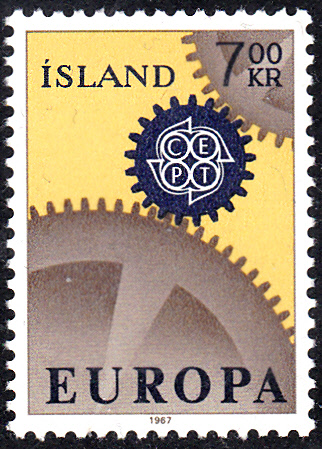 In Island erschienen die Europamarken 1967 am 2. Mai 1967. Hier die Marke zu 7,00 Kronen mit dem Gemeinschaftsmotiv "Ineinandergreifende Zahnräder, Antriebsrad mit CEPT-Emblem", die in einer Auflage von 1 000 000 Stück erschien.