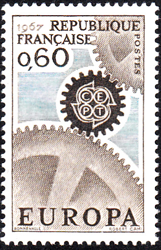 In Frankreich erschienen die Europamarken 1967 am 29. April 1967. Hier die Marke zu 0,60 Franc graubraun/blau mit dem Gemeinschaftsmotiv "Ineinandergreifende Zahnräder, Antriebsrad mit CEPT-Emblem", die in einer Auflage von 10 310 000 Stück erschien.