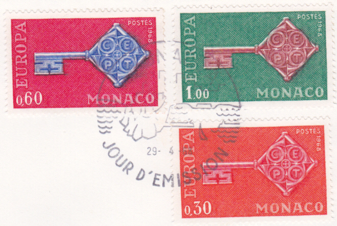 In Monaco erschienen die Europamarken 1968 am 29. April 1968. Hier eine postfrische Marke zu 0,60 Fr karminrot/violettblau mit dem Gemeinschaftsmotiv "Kreuzbartschlüssel mit CEPT-Emblem", die in einer Auflage von 503 968 Stück erschien.