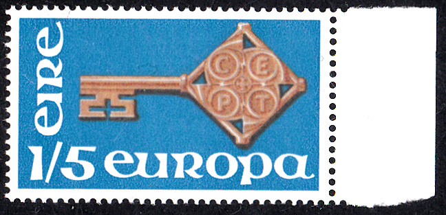 In Irland erschienen die Europamarken 1968 am 29. April 1968. Hier die Marke zu 1´5 Sc´Pg mit dem Gemeinschaftsmotiv "Kreuzbartschlüssel mit CEPT-Emblem ", die in einer Auflage von 2 000 000 Stück erschien.