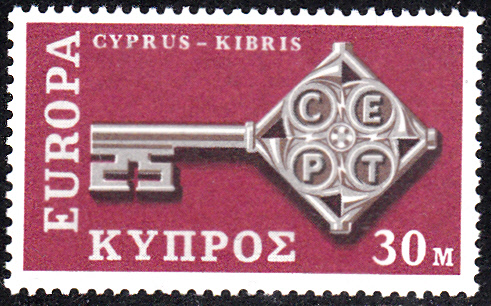 In Zypern erschienen die Europamarken 1968 am 29. April 1968. Hier eine postfrische Marke zu 30 Mills mit dem Gemeinschaftsmotiv "Kreuzbartschlüssel mit CEPT-Emblem", die in einer Auflage von 493 585 Stück erschien.