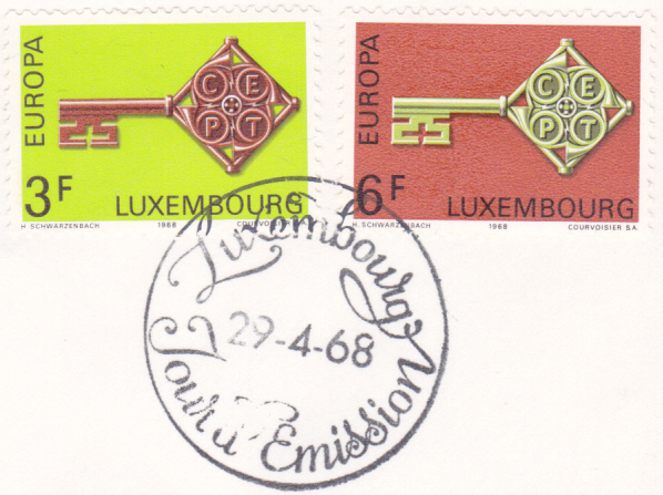 In Luxemburg erschienen die Europamarken 1968 am 29. April 1968. Hier die Marke zu 3 Fr mit dem Gemeinschaftsmotiv "Kreuzbartschlüssel mit CEPT-Emblem", die in einer Auflage von 1 000 000 Stück erschien.