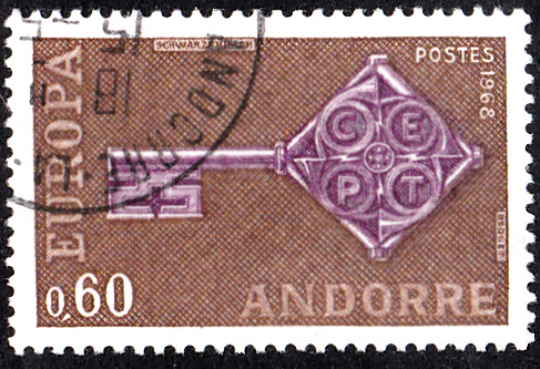 Bei der französischen Post in Andorra erschienen die Europamarken 1968 am 27. April 1967. Hier eine Marke zu 0.60 (Fr) braun/violett mit dem Gemeinschaftsmotiv "Kreuzbartschlüssel mit CEPT-Emblem", die in einer Auflage von 650 000 Stück erschien.