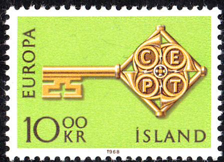In Island erschienen die Europamarken 1968 am 29. April 1968. Hier die Marke zu 10,00 Kronen mit dem Gemeinschaftsmotiv "Kreuzbartschlüssel mit CEPT-Emblem ", die in einer Auflage von 1 000 000 Stück erschien.