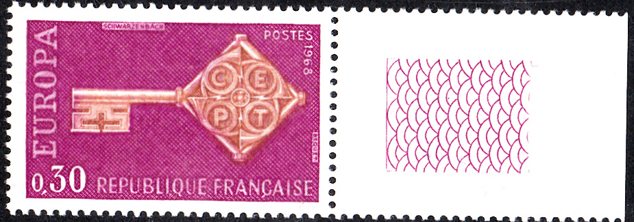 In Frankreich erschienen die Europamarken 1968 am 27.April 1968. Hier die Marke zu 0,30 Franc lilapurpur/orangebraun mit dem Gemeinschaftsmotiv "Kreuzbartschlüssel mit CEPT-Emblem", die in einer Auflage von 30 290 000 Stück erschien.