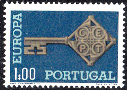 In Portugal erschienen die Europamarken 1968 am 29. April 1968 mit dem Gemeinschaftsmotiv "Kreuzbartschlüssel mit CEPT-Emblem". Hier die Marke zu 1,00 Escudo, die in einer Auflage von 9 000 000 Stück erschien.