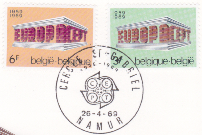 In Belgien sind die Europamarken 1969 am 26. April 1969 mit dem Gemeinschaftsmotiv "„EUROPA“ und „CEPT“ in Tempelform" erschienen. Hier der Wert zu 6 Francs, der in einer Auflage von 2 750 000 Stück erschien.
