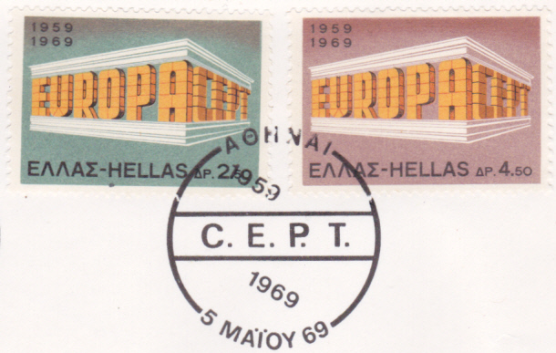 1969 erschienen zum 10-jährigen Jubiläum der CEPT insgesamt 48 Europamarken in 26 Ländern, dabei erstmals in Jugoslawien sowie im Vatikan. Als einheitliches Motiv diente ein antiker Tempel, gebildet aus den Wörtern EUROPA und CEPT, entworfen von Luigi Gashara und Giorgio Belli aus Italien.