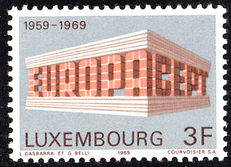 In Luxemburg erschienen die Europamarken 1969 am 19. Mai 1969. Hier die Marke zu 3 Fr mit dem Gemeinschaftsmotiv "„EUROPA“ und „CEPT“ in Tempelform", die in einer Auflage von 1 000 000 Stück erschien.