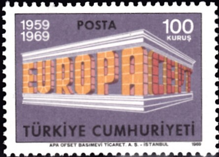 In der Türkei sind die Europamarken 1969 am 28. April 1969 mit dem Gemeinschaftsmotiv "„EUROPA“ und „CEPT“ in Tempelform" erschienen. Hier der Wert zu 100 Kurus, der in einer Auflage von 600 000 Stück erschien.