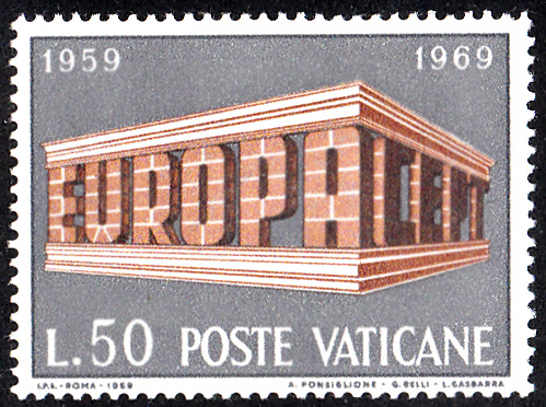 Im Vatikan erschienen die Europamarken 1969 am 28. April 1969. Hier eine Marke zu 50 L dunkelblaugrau/braunocker mit dem Gemeinschaftsmotiv "„EUROPA“ und „CEPT“ in Tempelform", die in einer Auflage von 2 128 200 Stück erschien.