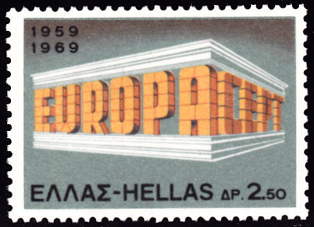 In Griechenland sind die Europamarken 1969 am 5. Mai 1969 mit dem Gemeinschaftsmotiv "„EUROPA“ und „CEPT“ in Tempelform" erschienen. Hier der Wert zu 2,50 Drachmen, der in einer Auflage von 5 628 056 Stück erschien.