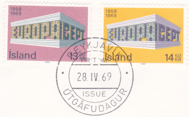 In Island erschienen die Europamarken 1969 am 28. April 1969. Hier die Marke zu 13,00 Kronen mit dem Gemeinschaftsmotiv "„EUROPA“ und „CEPT“ in Tempelform", die in einer Auflage von 1 000 000 Stück erschien.