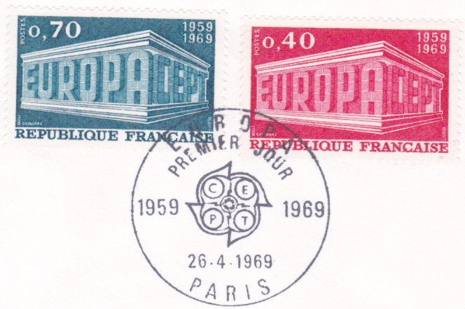 In Frankreich sind die Europamarken 1969 am 26. April 1969 mit dem Gemeinschaftsmotiv "„EUROPA“ und „CEPT“ in Tempelform" erschienen. Hier dieser Wert zu 0,40 Franc dunkelrotlila, der in einer Auflage von 24 920 000 Stück erschien.