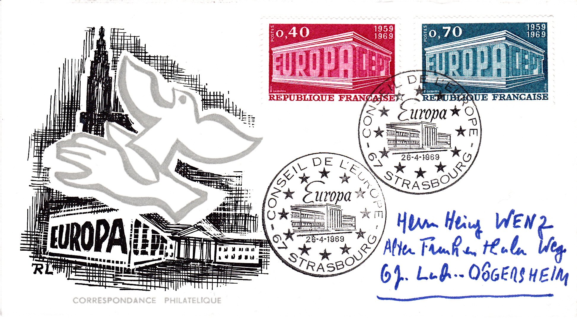 Beide Europamarken 1969 aus Frankreich auf einem Brief von Straßburg nach Ludwigshafen am Ersttag abgestempelt mit dem passenden Sonderstempel vom Postamt beim Europarat in Straßburg.